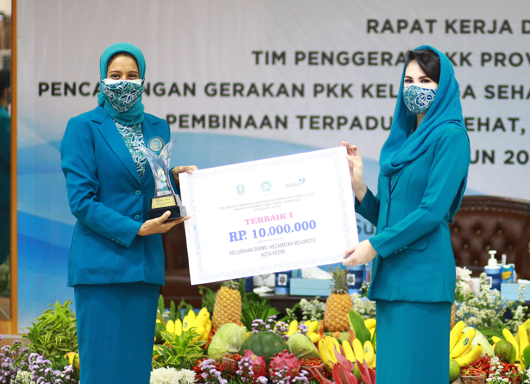 Ketua TP PKK Kota Kediri Ferry Silviana Abdullah Abu Bakar, menerima penghargaan dari Ketua TP PKK Provinsi Jawa Timur Arumi Bachsin Emil Dardak, Rabu (13/10/2021) bertempat di Ruang Rapat TP PKK Provinsi Jawa Timur. TP PKK Kota Kediri berhasil memperoleh predikat Terbaik I dalam lomba PKK Bangga Kencana Kesehatan kategori Lingkungan Bersih dan Sehat Tahun 2020 tingkat Provinsi.